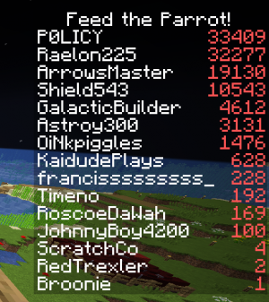 Parrot feeding event (April 27th, 2025 - May 9th, 2025) - Crazy-Fools.uk Survival server event which took place in the end of April 2025 in Eastcliff, The Heartlands. Players had a task from Broonie to feed the parrot 97000 seeds in order to it to become alive The event also contributed a scoreboard of seeds essance of which was to track the progress of players